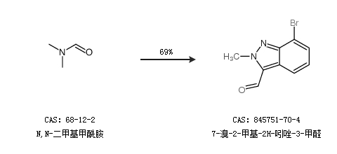 1.通过N,N-二甲基甲酰胺合成7-溴-2-甲基-2H-吲唑-3-甲醛,收率约69%;
