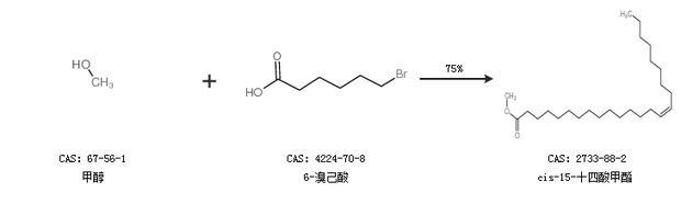 1.通过甲醇和6-溴己酸合成cis-15-十四酸甲酯,收率约75%;