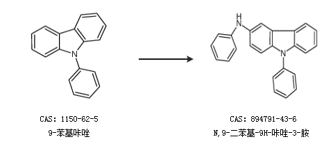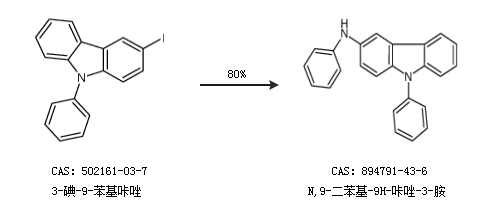 1.通过3-碘-9-苯基咔唑合成N,9-二苯基-9H-咔唑-3-胺,收率约80%;