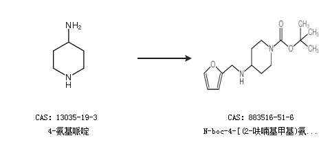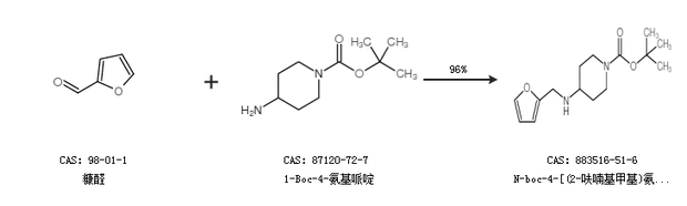 1.通过糠醛和1-Boc-4-氨基哌啶合成N-boc-4-[(2-呋喃基甲基)氨基]哌啶,收率约96%;