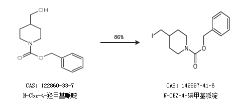 1.通过N-Cbz-4-羟甲基哌啶合成N-CBZ-4-碘甲基哌啶,收率约86%;