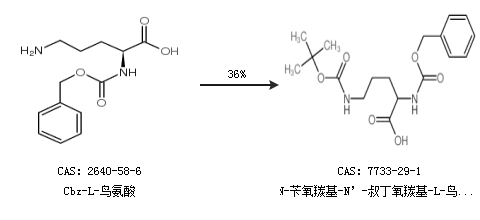 1.通过Cbz-L-鸟氨酸合成N-苄氧羰基-N’-叔丁氧羰基-L-鸟氨酸,收率约36%;