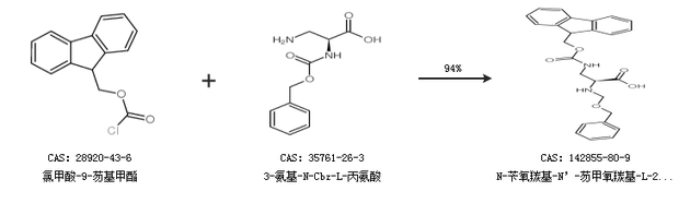 2.通过氯甲酸-9-芴基甲酯和3-氨基-N-Cbz-L-丙氨酸合成N-苄氧羰基-N’-芴甲氧羰基-L-2,3-二氨基丙酸,收率约94%;