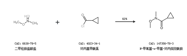 1.通过二甲羟胺盐酸盐和环丙基甲酰氯合成N-甲氧基-n-甲基-环丙烷羧酰胺,收率约62%;