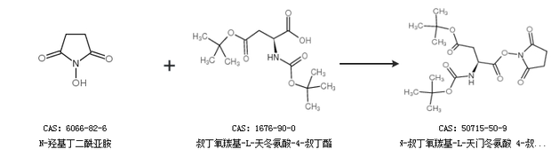 1.通过N-羟基丁二酰亚胺和叔丁氧羰基-L-天冬氨酸-4-叔丁酯合成N-叔丁氧羰基-L-天门冬氨酸 4-叔丁酯 1-羟基琥珀酰亚胺酯