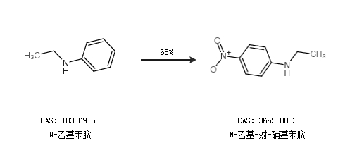 1.通过N-乙基苯胺合成N-乙基-对-硝基苯胺,收率约65%;