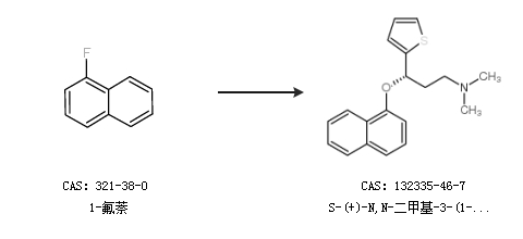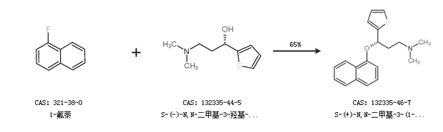 1.通过1-氟萘和S-(-)-N,N-二甲基-3-羟基-3-(2-噻吩)丙胺合成S-(+)-N,N-二甲基-3-(1-萘氧基)-3-(2-噻吩)-丙胺,收率约65%;