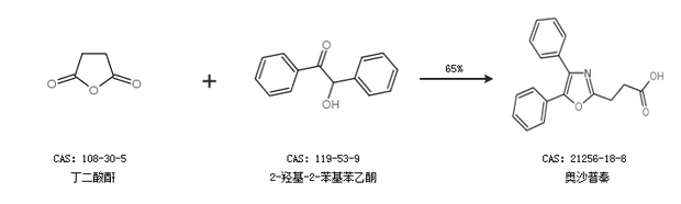 1.通过丁二酸酐和2-羟基-2-苯基苯乙酮合成奥沙普秦,收率约65%;