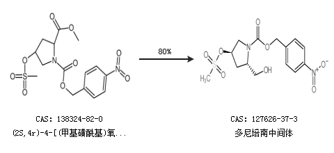 2.通过(2S,4r)-4-[(甲基磺酰基)氧基]-1,2-吡咯烷二羧酸 2-甲基 1-[(4-硝基苯基)甲基]酯合成多尼培南中间体,收率约80%;