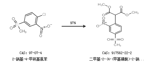1.通过2-硝基-4-甲砜基氯苯合成二甲基-2-(4-(甲基磺酰)-2-硝基苯基)丙二酸,收率约97%;