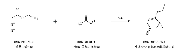 1.通过重氮乙酸乙酯和丁烯酮 甲基乙烯基酮合成反式-2-乙酰基环丙烷羧酸乙酯,收率约64%;