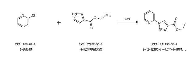 1.通过2-氯吡啶和4-吡唑甲酸乙酯合成1-(2-吡啶)-1H-吡唑-4-羧酸乙酯,收率约66%;