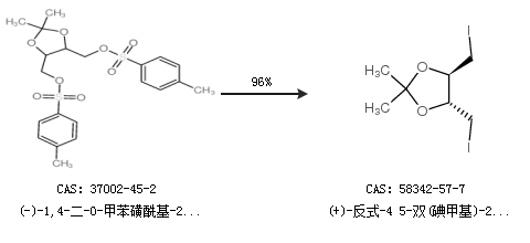 1.通过(-)-1,4-二-O-甲苯磺酰基-2,3-O-异亚丙基-L-苏糖醇合成(+)-反式-4 5-双(碘甲基)-2,2-二甲基-1 3-二氧戊环,收率约96%;