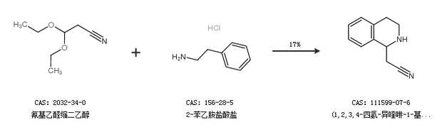 2.通过氰基乙醛缩二乙醇和2-苯乙胺盐酸盐合成(1,2,3,4-四氢-异喹啉-1-基)乙腈,收率约17%;