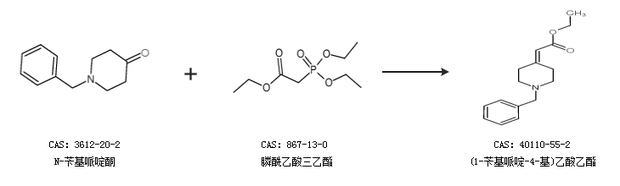1.通过N-苄基哌啶酮和膦酰乙酸三乙酯合成(1-苄基哌啶-4-基)乙酸乙酯,收率约99%;