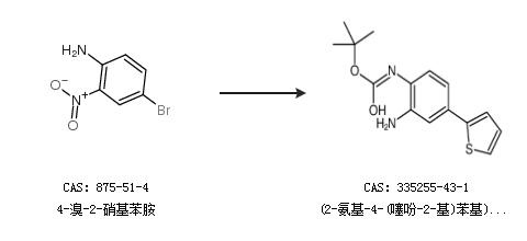 1.通过4-溴-2-硝基苯胺合成(2-氨基-4-(噻吩-2-基)苯基)氨基甲酸叔丁酯