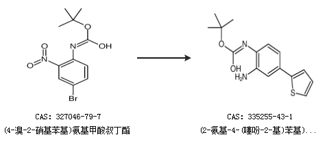 2.通过(4-溴-2-硝基苯基)氨基甲酸叔丁酯合成(2-氨基-4-(噻吩-2-基)苯基)氨基甲酸叔丁酯