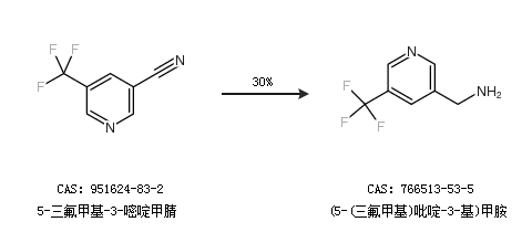 2.通过5-三氟甲基-3-嘧啶甲腈合成(5-(三氟甲基)吡啶-3-基)甲胺,收率约30%;