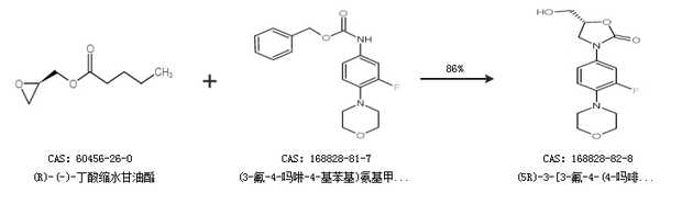 1.通过(R)-(-)-丁酸缩水甘油酯和(3-氟-4-吗啉-4-基苯基)氨基甲酸苄酯合成(5R)-3-[3-氟-4-(4-吗啡啉基)苯基]-5-羟甲基-2-恶唑烷酮,收率约86%;