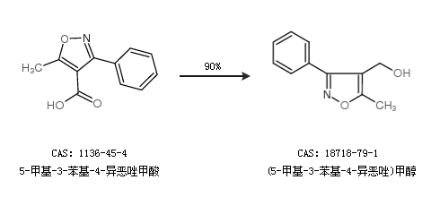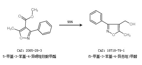 2.通过5-甲基-3-苯基-4-异噁唑羧酸甲酯合成(5-甲基-3-苯基-4-异恶唑)甲醇,收率约99%;