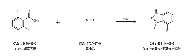 2.通过2,6-二氟苯乙酮和高纯氮合成(9ci)-4-氟-3-甲基-1H-吲唑,收率约85%;