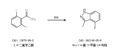 1.通过2,6-二氟苯乙酮合成(9ci)-4-氟-3-甲基-1H-吲唑,收率约85%;