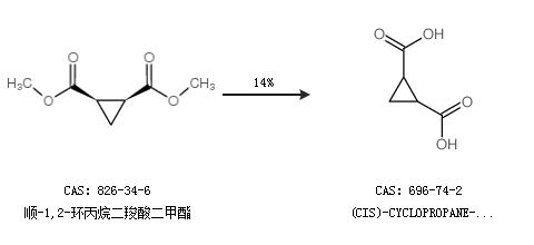 1.通过顺-1,2-环丙烷二羧酸二甲酯合成(CIS)-CYCLOPROPANE-1,2-DICARBOXYLIC ACID,收率约14%;
