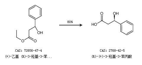 2.通过(+)-乙基 (R)-3-羟基-3-苯丙酸盐合成(R)-(+)-3-羟基-3-苯丙酸,收率约80%;