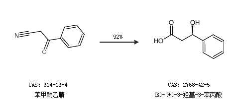 1.通过苯甲酰乙腈合成(R)-(+)-3-羟基-3-苯丙酸,收率约92%;