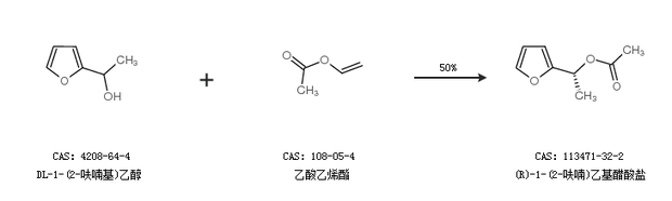 1.通过DL-1-(2-呋喃基)乙醇和乙酸乙烯酯合成(R)-1-(2-呋喃)乙基醋酸盐,收率约50%;
