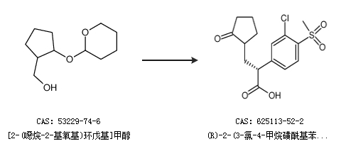 2.通过[2-(噁烷-2-基氧基)环戊基]甲醇合成(R)-2-(3-氯-4-甲烷磺酰基苯基)-3-(2-氧代环戊基)丙酸