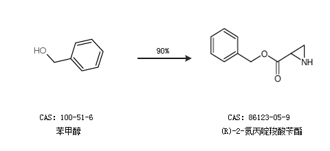 1.通过苯甲醇合成(R)-2-氮丙啶羧酸苄酯,收率约90%;