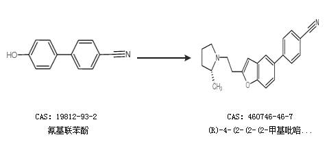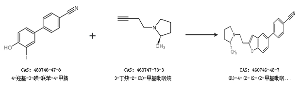 1.通过4-羟基-3-碘-联苯-4-甲腈和3-丁炔-2-(R)-甲基吡咯烷合成(R)-4-(2-(2-(2-甲基吡咯烷-1-基)乙基)苯并呋喃-5-基)苯甲腈