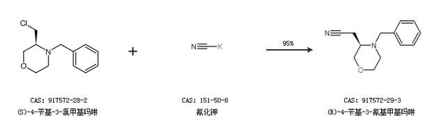 1.通过(S)-4-苄基-3-氯甲基吗啉和氰化钾合成(R)-4-苄基-3-氰基甲基吗啉,收率约95%;