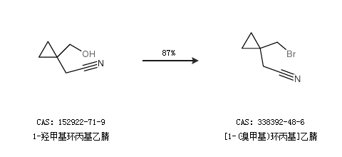 1.通过1-羟甲基环丙基乙腈合成[1-(溴甲基)环丙基]乙腈,收率约87%;