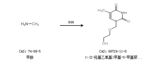 1.通过甲胺合成1-(2-羟基乙氧基)甲基-5-甲基尿嘧啶,收率约84%;