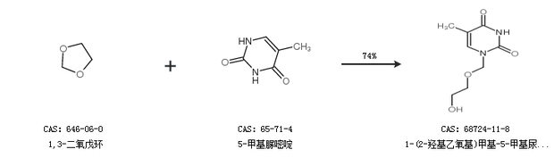 2.通过1,3-二氧戊环和5-甲基脲嘧啶合成1-(2-羟基乙氧基)甲基-5-甲基尿嘧啶,收率约74%;