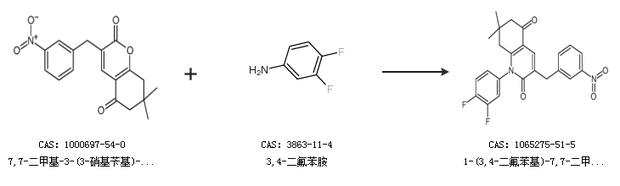 1.通过7,7-二甲基-3-(3-硝基苄基)-7,8-二氢-2H-色烯-2,5(6H)-二酮和3,4-二氟苯胺合成1-(3,4-二氟苯基)-7,7-二甲基-3-(3-硝基苄基)-7,8-二氢喹啉-2,5(1H,6H)-二酮