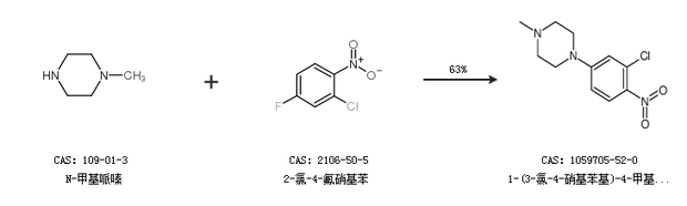 1.通过N-甲基哌嗪和2-氯-4-氟硝基苯合成1-(3-氯-4-硝基苯基)-4-甲基哌嗪,收率约63%;