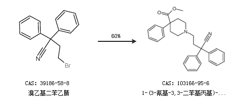 1.通过溴乙基二苯乙腈合成1-(3-氰基-3,3-二苯基丙基)-4-苯基-4-哌啶羧酸甲酯,收率约60%;