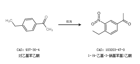 1.通过对乙基苯乙酮合成1-(4-乙基-3-硝基苯基)乙酮,收率约81%;