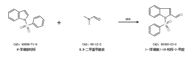 1.通过N-苯磺酸吲哚和N,N-二甲基甲酰胺合成1-(苯磺酰)-1H-吲哚-2-甲醛,收率约86%;