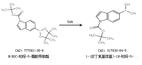 1.通过N-BOC-吲哚-5-硼酸频那酯合成1-(叔丁氧基羰基)-1H-吲哚-5-硼酸,收率约54%;