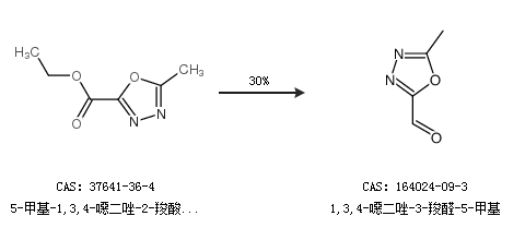 1.通过5-甲基-1,3,4-噁二唑-2-羧酸乙酯合成1,3,4-噁二唑-3-羧醛-5-甲基,收率约30%;