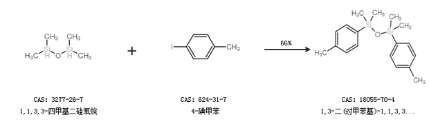 2.通过1,1,3,3-四甲基二硅氧烷和4-碘甲苯合成1,3-二(对甲苯基)-1,1,3,3-四甲基二硅氧烷,收率约66%;