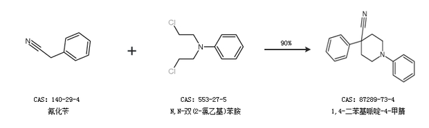 1.通过氰化苄和N,N-双(2-氯乙基)苯胺合成1,4-二苯基哌啶-4-甲腈,收率约90%;