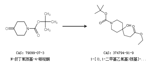 2.通过N-叔丁氧羰基-4-哌啶酮合成1-[(1,1-二甲基乙氧基)羰基]-4-羟基-4-哌啶丙酸乙酯