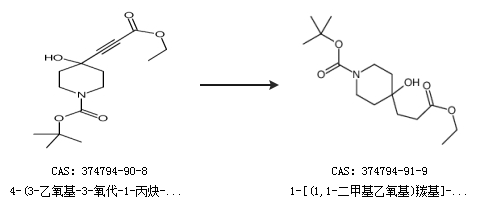 1.通过4-(3-乙氧基-3-氧代-1-丙炔-1-基)-4-羟基-1-哌啶羧酸 1,1-二甲基乙酯合成1-[(1,1-二甲基乙氧基)羰基]-4-羟基-4-哌啶丙酸乙酯