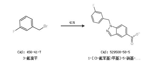 2.通过3-氟溴苄合成1-[(3-氟苯基)甲基]-5-硝基-1H-吲唑,收率约41%;