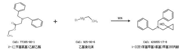 1.通过2-(二苄基氨基)乙酸乙酯和乙基溴化镁合成1-[[双(苯基甲基)氨基]甲基]环丙醇,收率约90%;
